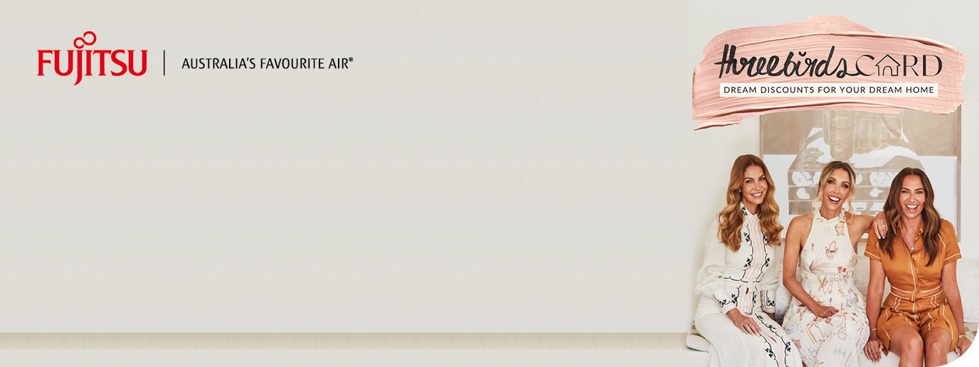 *T&Cs apply. Fujitsu offers Cardholders up to $300 cash back when they purchase selected Fujitsu Air Conditioners. Offer available to AU-resident Three Birds Dream Discount cardholders only. Stock may vary. See T&Cs for list of all eligible products. Purchase by 4:59pm AEST 31 July 2026. Claim by 4:59pm AEST 31 August 2026. Domestic/residential purchases only. Offer excludes installation. Value of cash back is based on the following: Cooling Only Systems: 3.5kw or below = $100, Above 3.5kw and below 8kw = $150, 8kw or above - $200; Reverse Cycle Split Systems: 3.5 kw or below = $150, Above 3.5 kw and below 8kw = $200, 8kw or above = $250; Reverse Cycle Multi Systems = $300; Ducted Systems: 3.5kw or below = $150, Above 3.5kw and below 8kw = $200, 8kw and below 10kw = $250, 10kw and above = $300. Keep proof of purchase with Fujitsu System Type & claimant’s full name clearly visible. Cash back will sent be in the form of a Digital Gift Card & may take up to 4 weeks to process. This offer cannot be redeemed against a purchase prior to 1st September 2025 and cannot be used in conjunction with any other offer (i.e. you cannot claim in this offer and another Fujitsu offer for the same purchase). Offer is subject to change.
